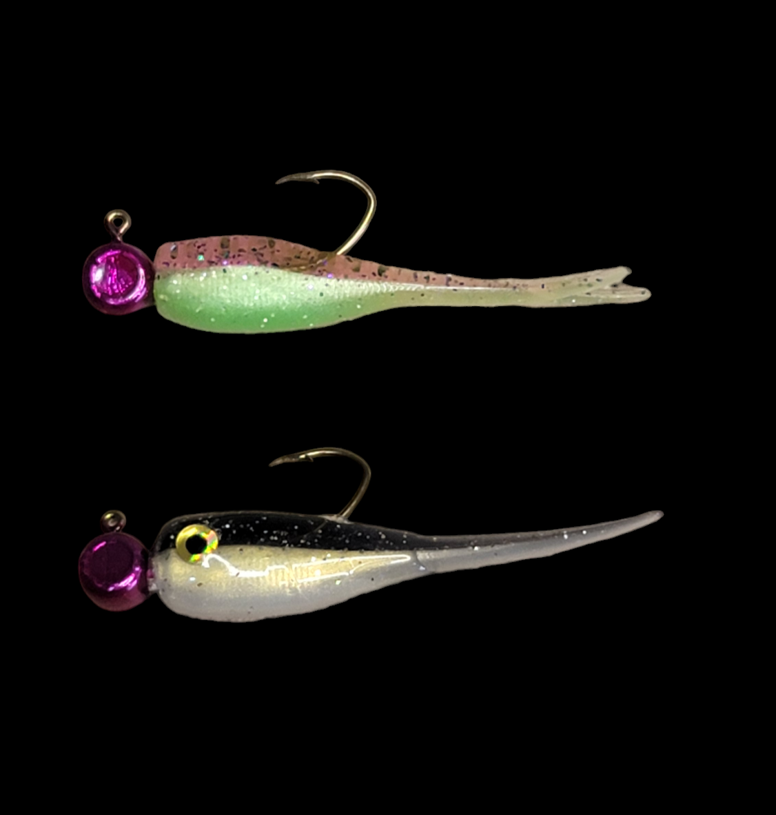 Our hand made ultra finesse baits are made with super soft plastic that never stops moving! They are specialy formulated and infused with "The Juice", a fish catching scent that makes these baits irresistable! All our baits are great for pan fishing in every season. Smaller baits are great when there is a finicky bite. We are a family owned and operated business and all of our plastics are proudly made in the USA!